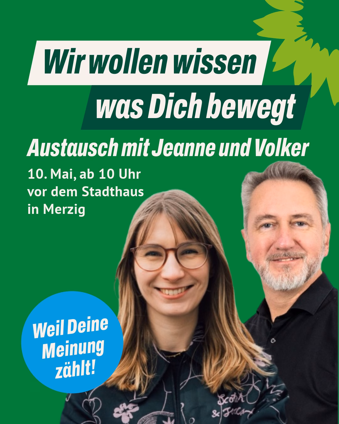 Am Samstag, 10.05.2025 sind die Grünen Merzig-Wadern von 10-13 Uhr mit einem Informationsstand vor dem Stadthaus vertreten. Unter dem Motto „Was wünschst Du Dir für‘s Saarland?“ werden auch unsere Landesvorsitzende Jeanne Dillschneider, MdB und unser Landesvorsitzender Volker Morbe vor Ort sein, um sich mit Bürgerinnen und Bürgern auszutauschen. Was soll Jeanne in Berlin für das Saarland bewegen? Welche Themen muss Volker als Landesvorsitzender hier vor Ort anpacken? Genau darüber wollen wir ins Gespräch kommen. Einfach vorbeikommen, mitdiskutieren und Grüne Politik mitgestalten.