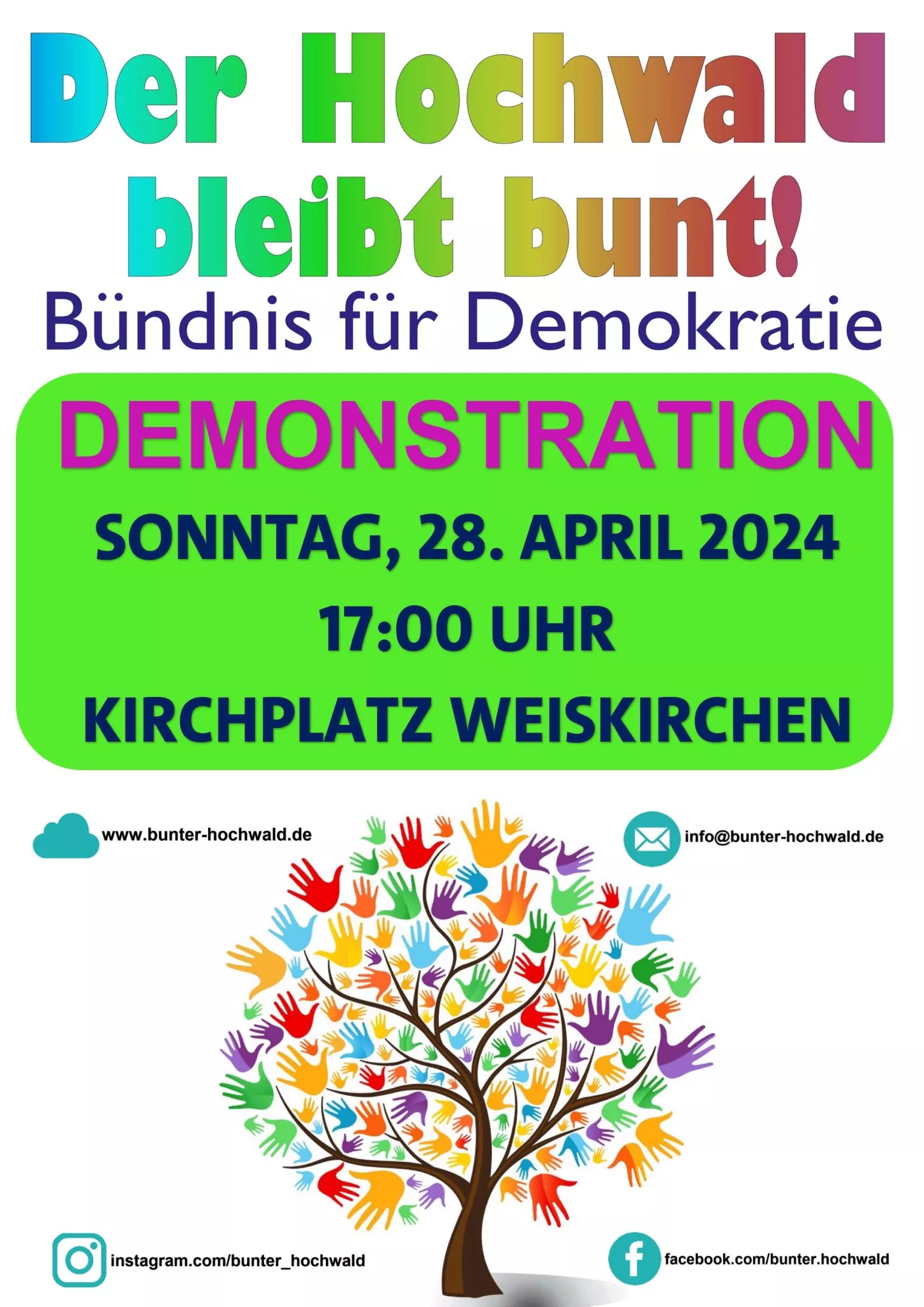Demonstration „Der Hochwald bleibt bunt“ Demonstration gegen Rechts, organisiert vom Bündnis Demokratie. 28.04.2024, 17:00, Kirchplatz Weiskirchen Sonntag28.04.202417:00 - 19:00 UhrKirchplatz66709 Weiskirchenorganisiert von Bündnis DemokratieDownload als ics-Datei