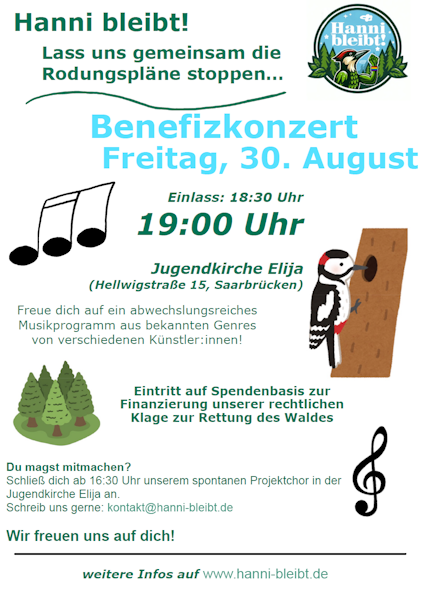 Der Eintritt erfolgt auf Spendenbasis zur Finanzierung unserer Klage, damit wir die Rodung des Waldgebiets Hanni auf rechtlichem Wege verhindern können.
