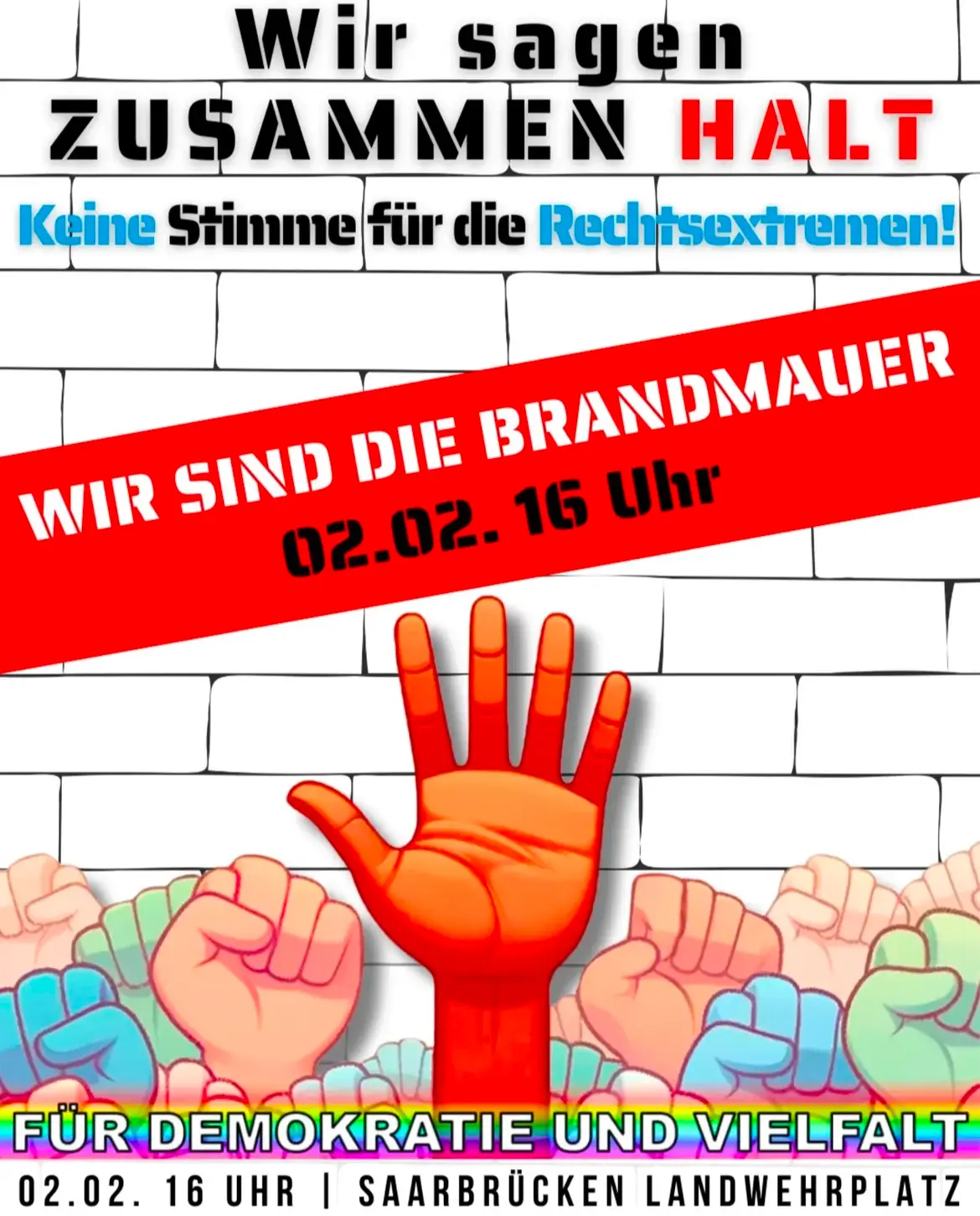 Wir treffen uns am Sonntag, 02.Februar, um 15 Uhr am Bahnhof Merzig. Von dort fahren wir zusammen mit der Bahn nach Saarbrücken und gehen von dort zum Landwehrplatz zur Demo gegen Rechts.